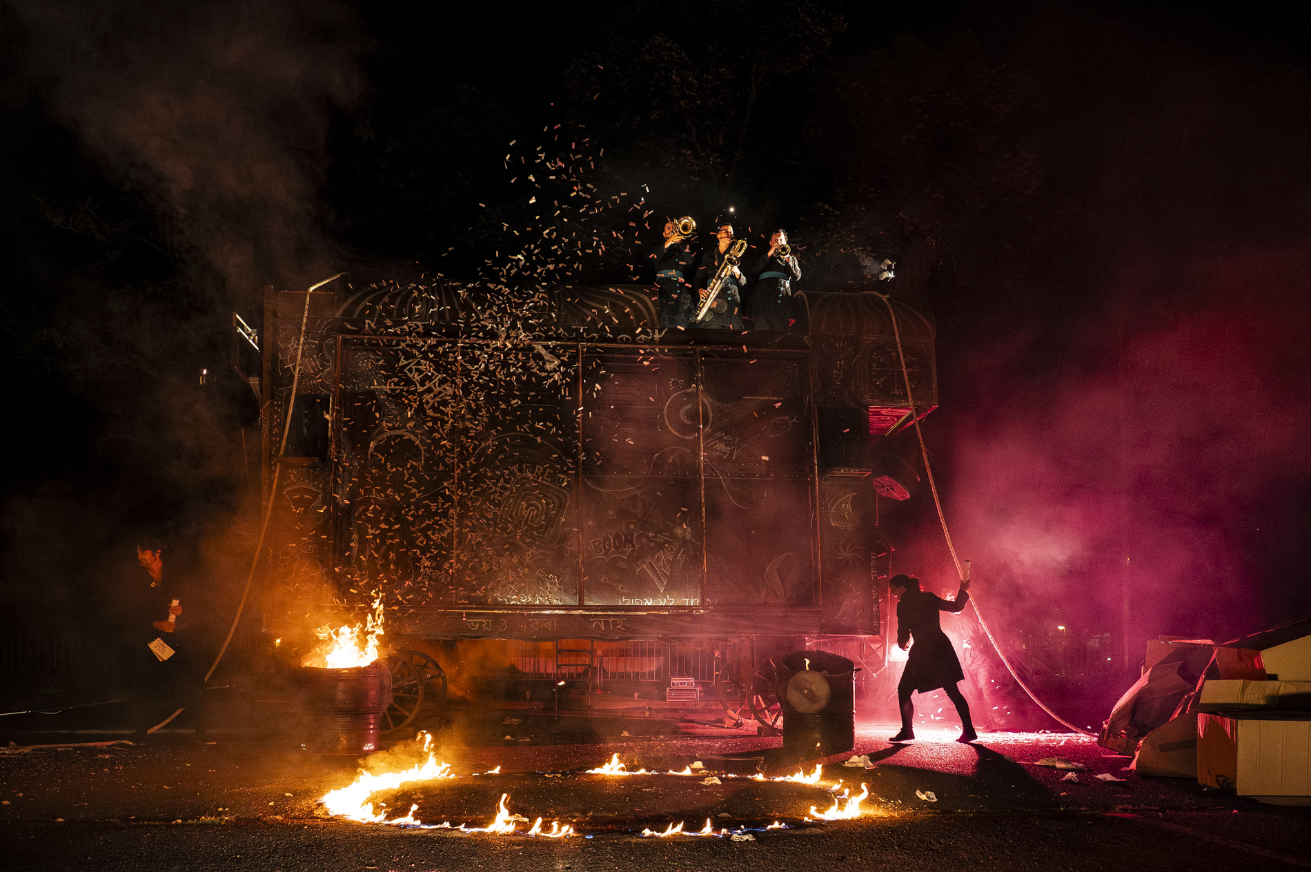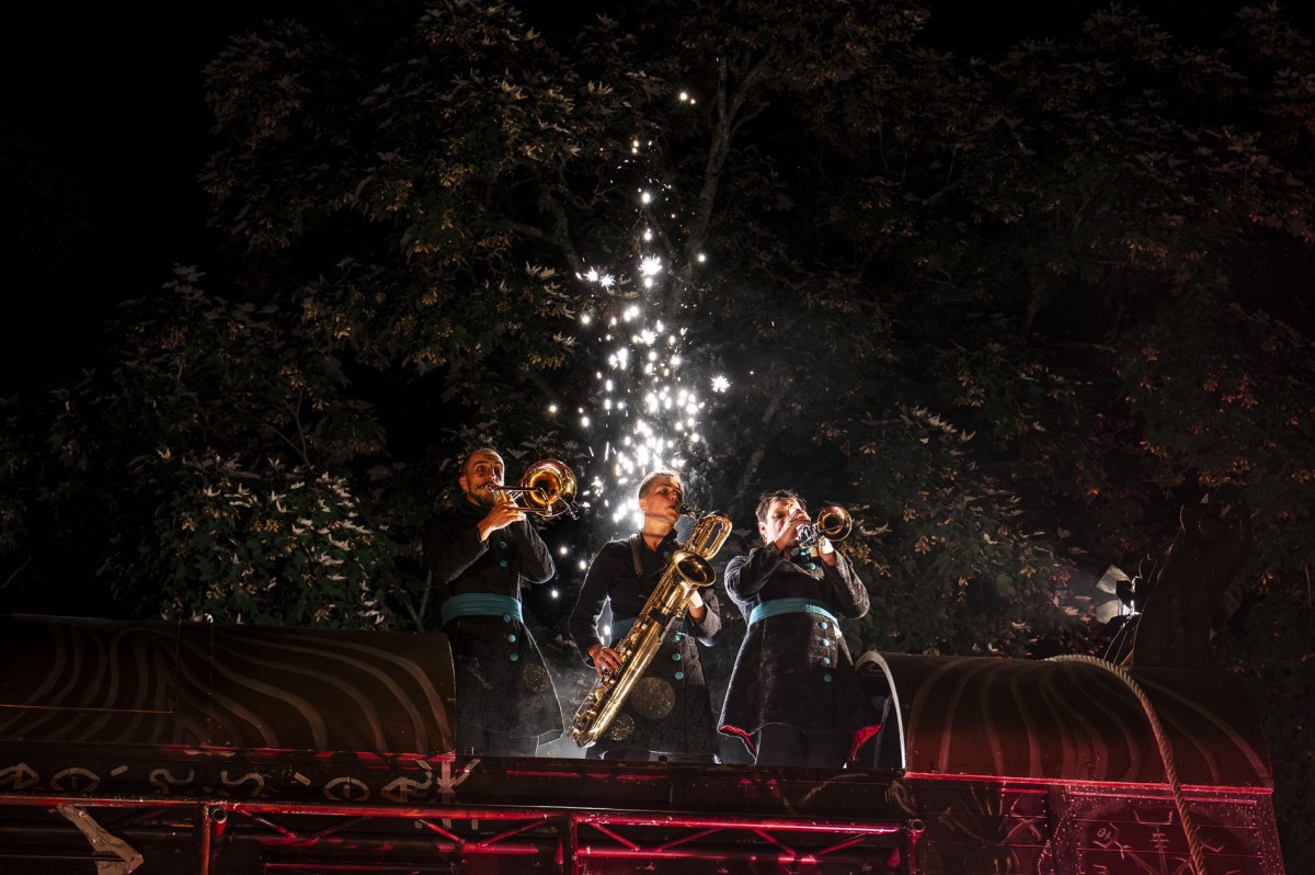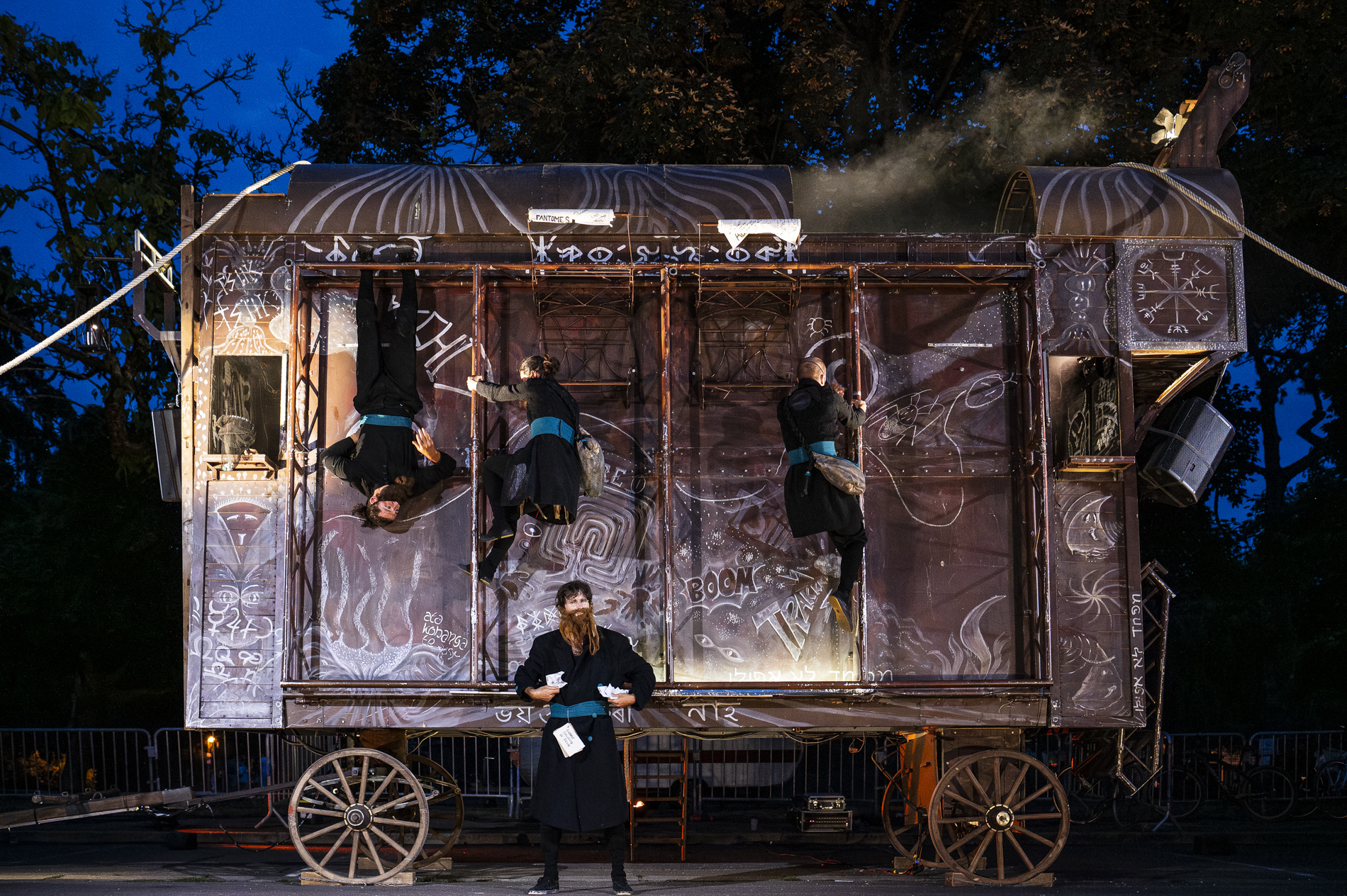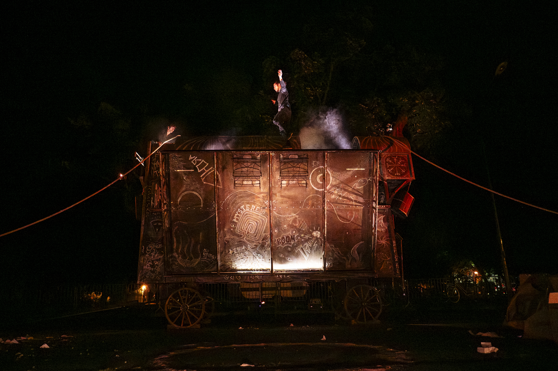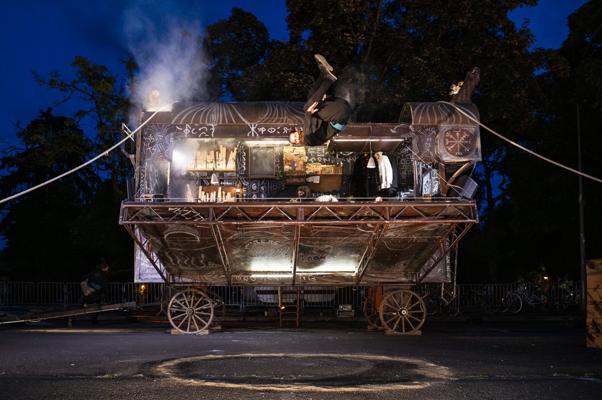 Un attelage titanesque entre Cheval de Troie et théâtre ambulant, des dompteurs de chimère, une musique originale entre western et dance floor et des parcours acrobatiques sur diligence tatouée...